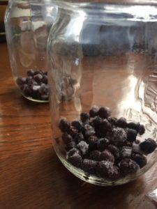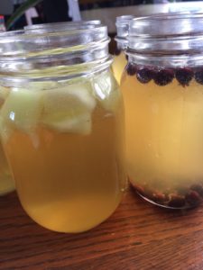 All you have to do is pour the fruit into the jars (I use 1/4 cup for a pint and 1/2 cup for a quart) and then fill them up with kombucha, leaving a bit of space at the top. Then, screw the lid on tight and leave sit on the counter for 2-7 days until it has as much fizz as you would like. Remove the fruit with a clean stainless steel spoon or nylon strainer, as plastic or other metals can react negatively with the kombucha. The nylon strainer that I use can be found here. Once the fruit has been removed, place the lids back on the jars and move to fridge. The fruit can be used in smoothies, as yogurt topping, in fruit snacks, or even as a treat for your chickens. I just use whatever fruit I have in the fridge or freezer. Some of our favorite flavors are Saskatoon & raspberry. Fresh picked berries in the summer time are best!