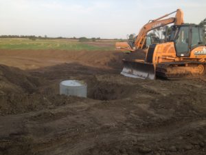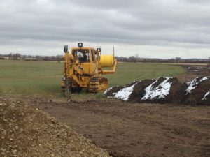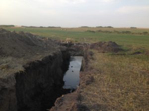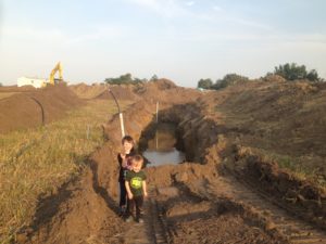 It was a slow process getting everything set up and all of our services installed.  Our well had been dug, and the septic system installed, but we didn’t have power to run them so we had to make daily trips to town for showers/baths and rent a port a potty to use as a washroom since the camper didn’t have enough water for us to use on a regular basis and we didn’t have a big enough truck to haul the camper, so we had to rely on my dad to fill and empty it.  During this time, we got a driveway built and with the help of Cassandra’s uncle, Tyler got the water lines all trenched in from the well to the house and to what would be our future barnyard, despite having the trenches constantly filling up with ground water.