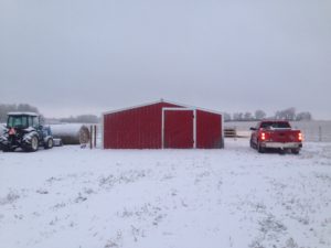 We fenced off  a few acres and purchased some windbreaks and free standing panels so we were able to bring our cows and yaks home from the pasture for the winter.  We had a small barn (two calf shelters pushed together with doors put in on the ends) built  and moved in.