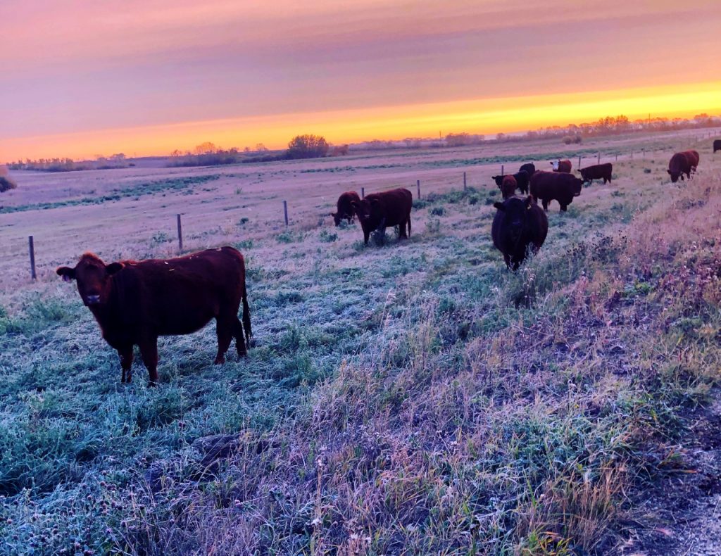 Galloways “fatten from the inside out”. Unlike other breeds that produce a layer of fat to keep warm in the winter, Galloway and Galloway cross cattle have a thick dual hair coat which instead allows them to deposit fine flecks of intramuscular marbling, even on a 100% forage diet, resulting in beef that is consistently tender, juicy, and rich in flavor. Our Galloway cows are bred to a Red Angus Bull. This cross produces calves with the the best traits from both the Galloway and the Angus breed resulting in calves perfect for healthy, delicious, grass fed and finished beef production.